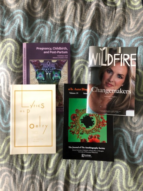 I’ve been so busy making the most of my time on this planet that I have mostly forgone the opportunity to recount what I’ve already done. So today I am compiling a list of my published writing of which I have not mentioned anything here before. In the last couple of years I have published two research articles (in A/B Auto/Biograpy Studies and Journal of the Motherhood Initiative), a song lyric of mine has been published in Lyrics As Poetry and a an introductory article about my creative works related to cancer came out this year in Wildfire Magazine. Yet, somehow I forgot to mention any of these happy moments. It took me a while to realize that everything relates. And that by letting you know about my works and these lovely journals and magazines, I’ll let you decide how you might want to relate to this stuff. Of course, in 2019 I published my Finnish language memoir Viimeinen kirjani: kirjoituksia elämästä. I’ll write a separate post about that later.